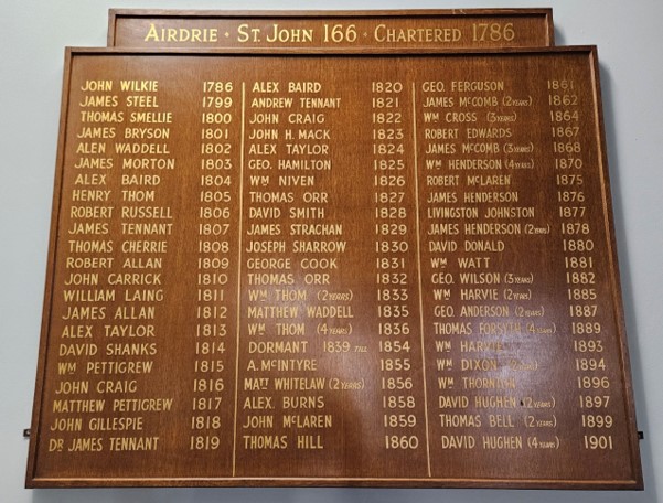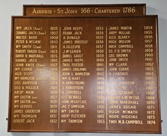 Lodge Airdie St John was established by charter in 1786, and is very much integral to the Town of Airdrie in North Lanrkshire. Part of the Lanarkshire Middle Ward of The Grand Lodge of Ancient Free and Accepted Masons of Scotland, the lodge has survived and thrived over the centuries in various locations around the town.